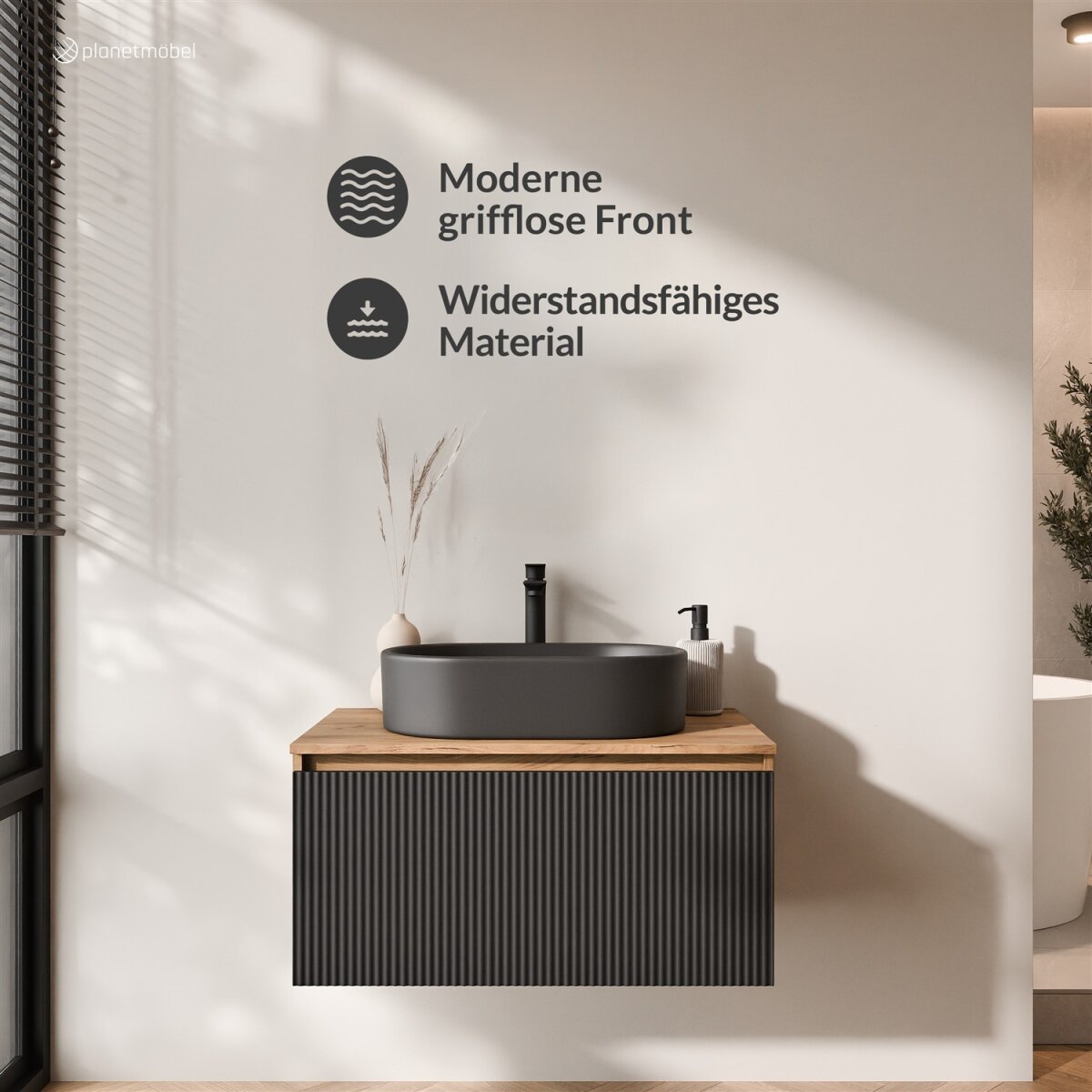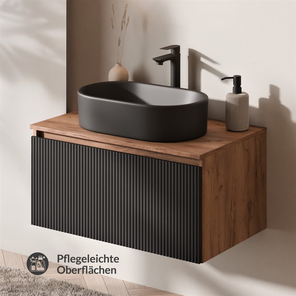 The generous width of the countertop also creates an all-around storage surface – perfect for soap dispensers, toothbrush cups, or small accessories.