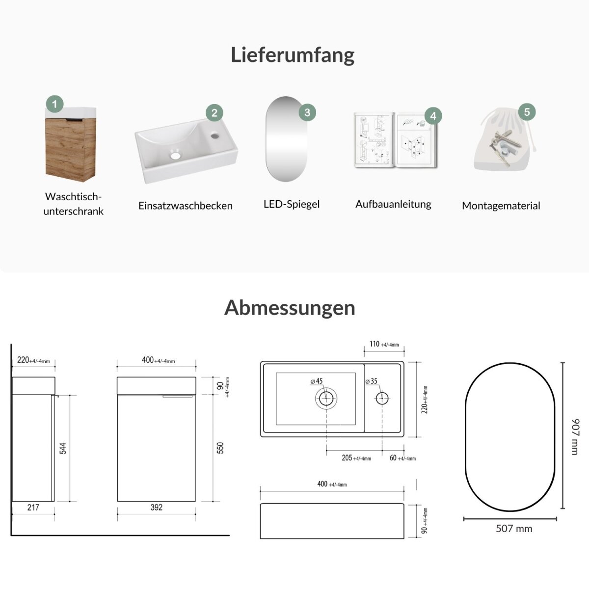 | Lieferungsumfang: | 1x Waschtischunterschrank, 1x Waschbecken, 1x Spiegel, 1x Aufbauanleitung, 1x Montagematerial |