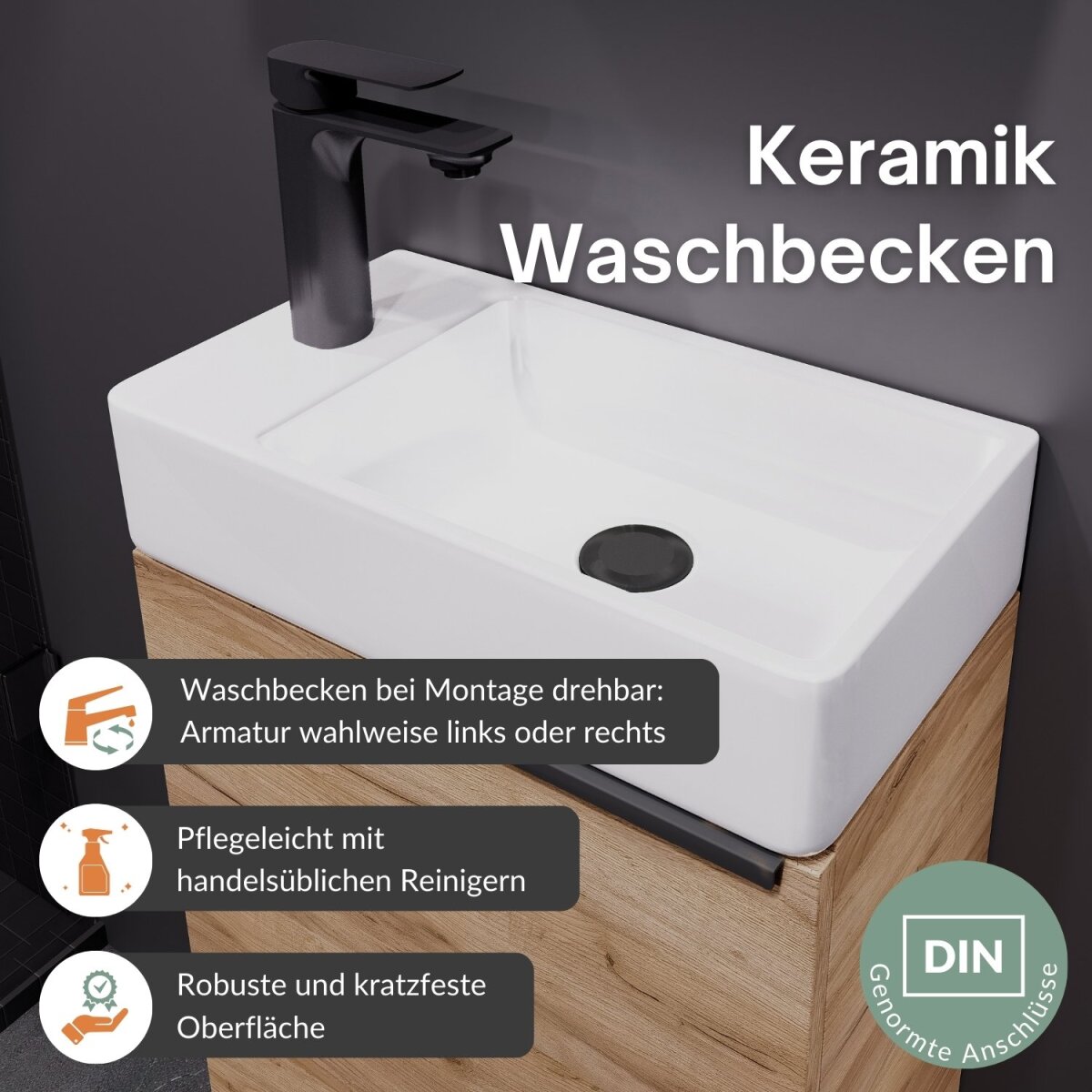 Der elegante Unterschrank bietet überraschend viel Stauraum für Pflegeartikel und Badaccessoires. Die Soft-Close-Türen lassen sich angenehm leise schließen, während die wasserabweisende Oberfläche ideal für den täglichen Einsatz geeignet ist. Das Keramikwaschbecken überzeugt durch Langlebigkeit, Pflegeleichtigkeit und eine variable Armaturposition – links oder rechts montierbar.