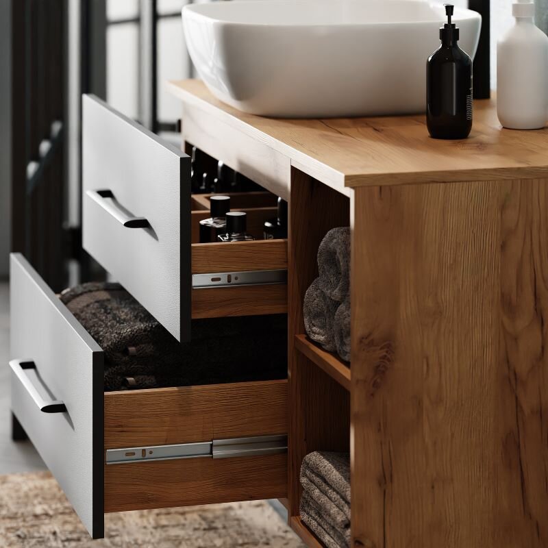 Melaminbeschichtete Flächen sind unempfindlich im täglichen Gebrauch und leicht zu pflegen. Das Keramikbecken bietet eine glatte Haptik und präzise Kanten. Gedämpfte Soft-Close-Läufe reduzieren Geräusche und schonen Beschläge, während die Inneneinteilung Ordnung hält. Die Kombination aus Gold Eiche und Anthrazit betont die geometrische Formensprache – ein Badezimmer-Set, das beständig gut aussieht und Funktionen sinnvoll vereint.