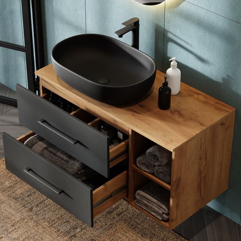 Dieses Badezimmer-Set kombiniert ein 100-cm-Waschtischunterschrank mit einem 60-cm-Aufsatzwaschbecken in Schwarz und einem 50-cm-Spiegel ohne LED. Die großzügige Beckenbreite erleichtert tägliche Routinen wie Zähneputzen oder Pflege, während die Schubladen wichtige Utensilien nah am Waschplatz bereithalten. So bleibt die Oberfläche frei und das Bad wirkt ruhiger. Ein praktisches Waschbecken Set Bad, das Funktion und Stil im Alltag verbindet.