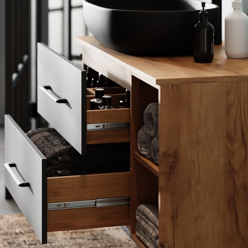 Der Unterschrank besteht aus strapazierfähigem Holzwerkstoff mit melaminbeschichteten Oberflächen. Diese sind leicht zu reinigen und unempfindlich gegenüber typischen Spritzern im Bad. Die Soft-Close-Führung lässt die Schubladen sanft schließen – angenehm leise und materialschonend. Das Keramik-Aufsatzwaschbecken überzeugt mit glatter Haptik und pflegeleichter Oberfläche, während die hängende Montage luftige Leichtigkeit in den Raum bringt.