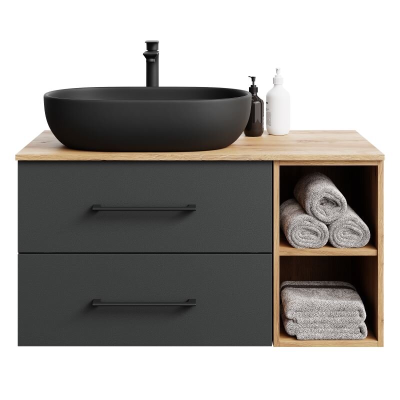 - Funktionen & Details: Soft-Close-Schubladen, Keramik-Aufsatzwaschbecken, hängende Montage möglich, gut nutzbarer Stauraum.