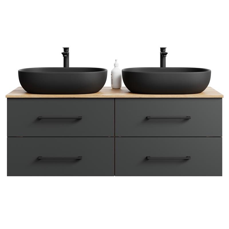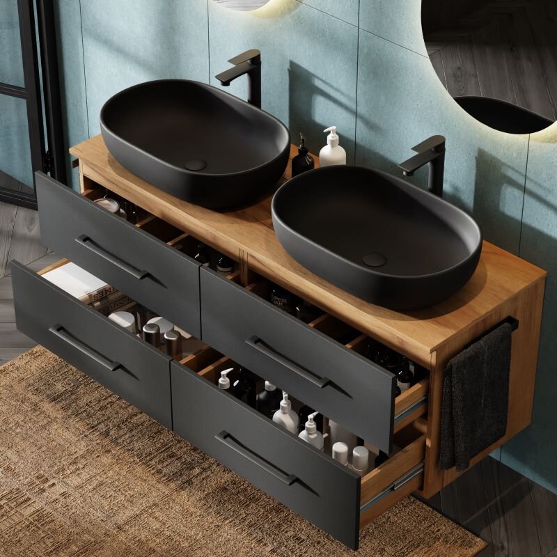 Zwei 60-cm Aufsatzwaschbecken, leises Soft-Close und ein warmer Eiche-Anthrazit-Kontrast: Das LUX Badmöbel-Set 140 cm verbindet komfortablen Platz mit pflegeleichter Qualität.