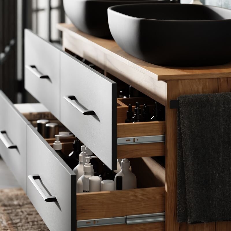 - Funktionen & Details: Keramikbecken, Soft-Close-Schubladen für leises Schließen, übersichtliche Stauraumaufteilung.