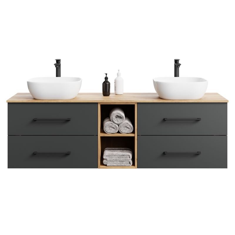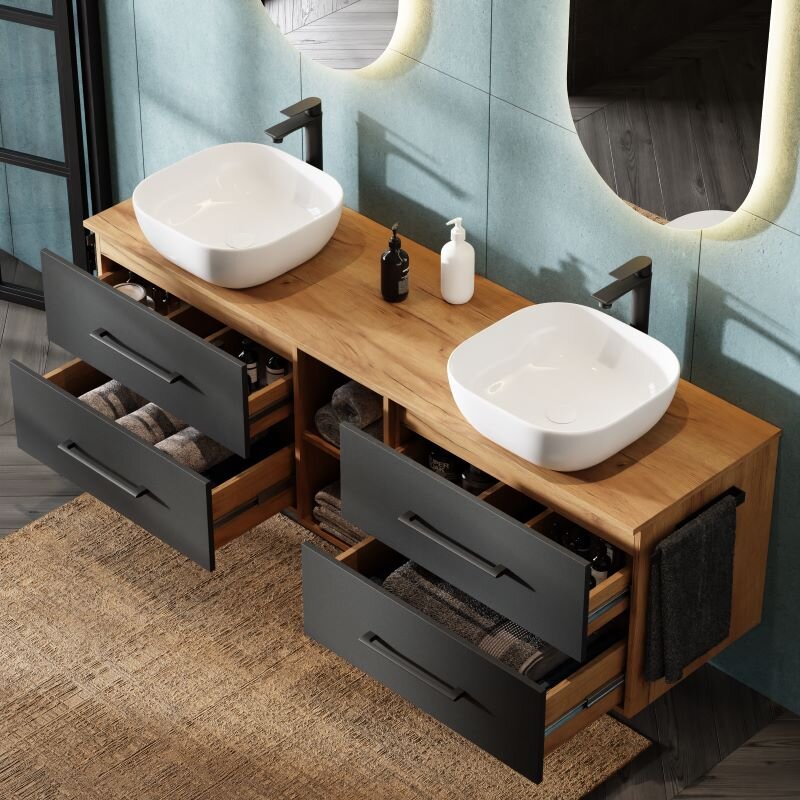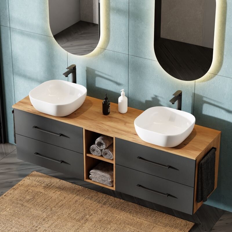 - Maße & Format: 170 × 52,6 × 48 cm (B×H×T); zwei Aufsatzwaschbecken Ø 42 cm, großzügiger Stauraum.
