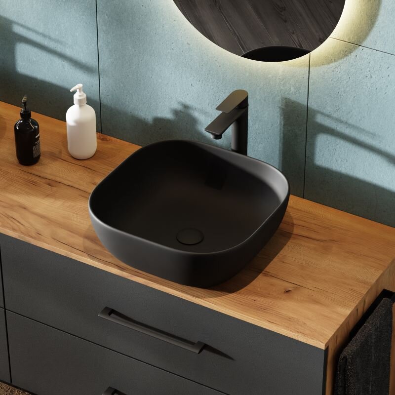 - Material & Verarbeitung: Holzwerkstoff mit Melaminbeschichtung; pflegeleicht & robust. Schwarze Keramik-Aufsatzwaschbecken, stabile Metall-Bügelgriffe, leise Soft-Close-Auszüge.