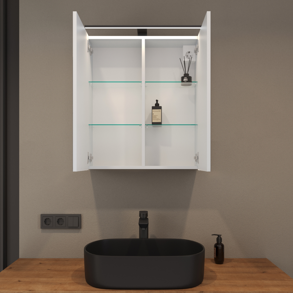 Der Spiegelschrank ist ausgestattet mit vier Glaseinlegeböden, deren Höhe frei wählbar ist, sowie einer Trennwand. Dies ermöglicht eine klare Struktur und unterstützt Sie bei Ihren täglichen Routinen. (ACHTUNG: ohne Steckdosenbox!)