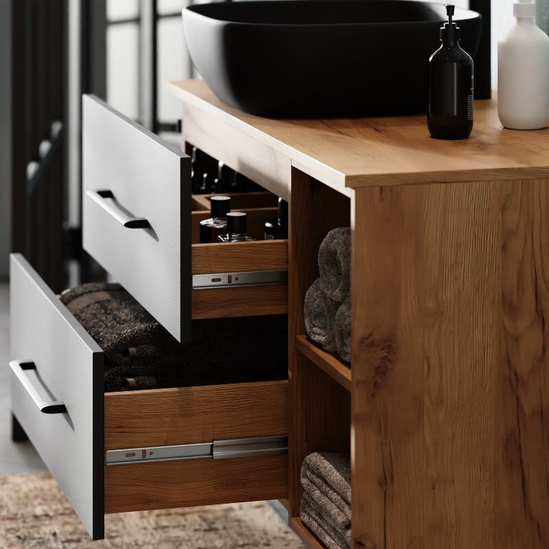 - Funktionen & Details: Soft-Close-Schubladen, Keramikbecken, glatte Oberflächen; Stauraum für Badutensilien.