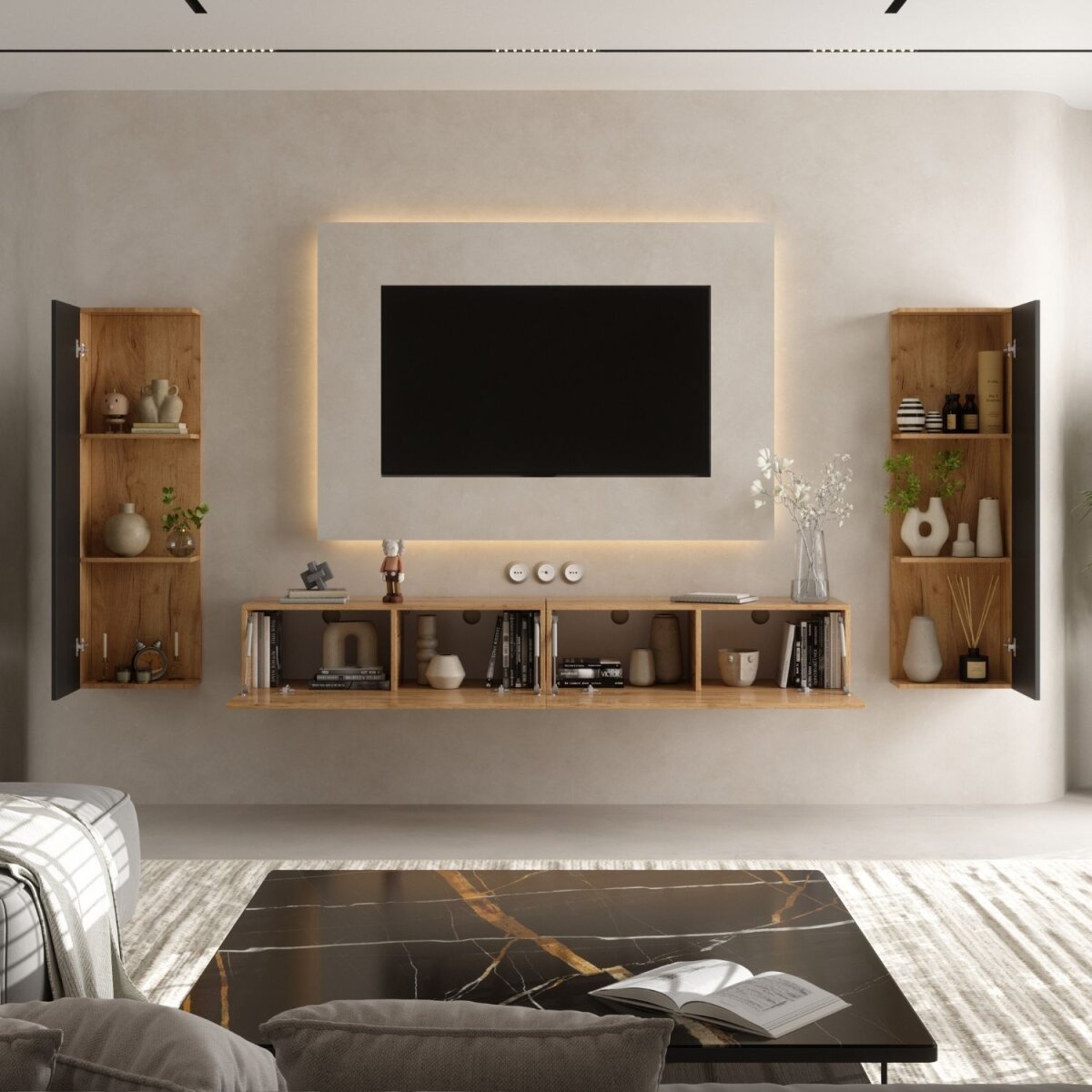 Gold Eiche wirkt warm und passt zu modernen Wohnbildern. Ergänzen Sie das Ensemble mit einer TV Wohnwand Holz oder kombinieren Sie ein TV Board Eiche hängend mit offenen Regalen. Wer ein TV Board Modern Design bevorzugt, findet hier eine ruhige, zeitgemäße Basis.
