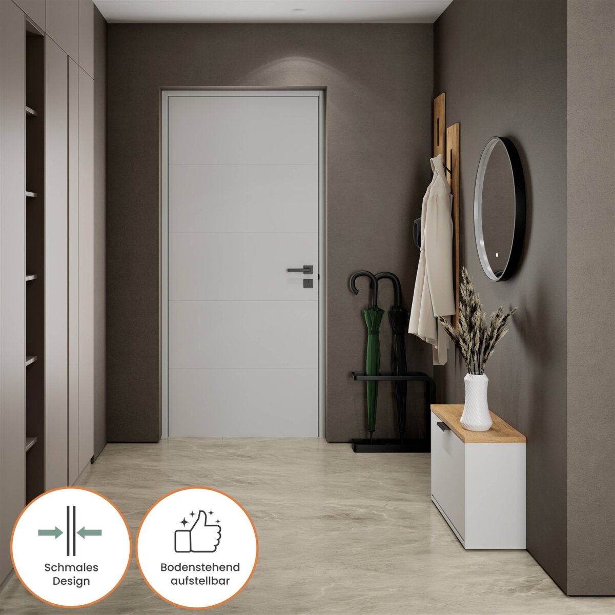 Dieser moderne Schuhschrank ist die perfekte Lösung für alle, die auch in engen Fluren oder kompakten Dielen nicht auf Stil und Ordnung verzichten möchten. Mit einer Tiefe von nur 23 cm bietet er überraschend viel Stauraum bei minimalem Platzbedarf. Hinter der grifflosen Klappe verbirgt sich ein durchdacht strukturierter Innenraum mit einem flexibel nutzbaren Regalboden – ideal zur Aufbewahrung verschiedenster Schuhtypen.