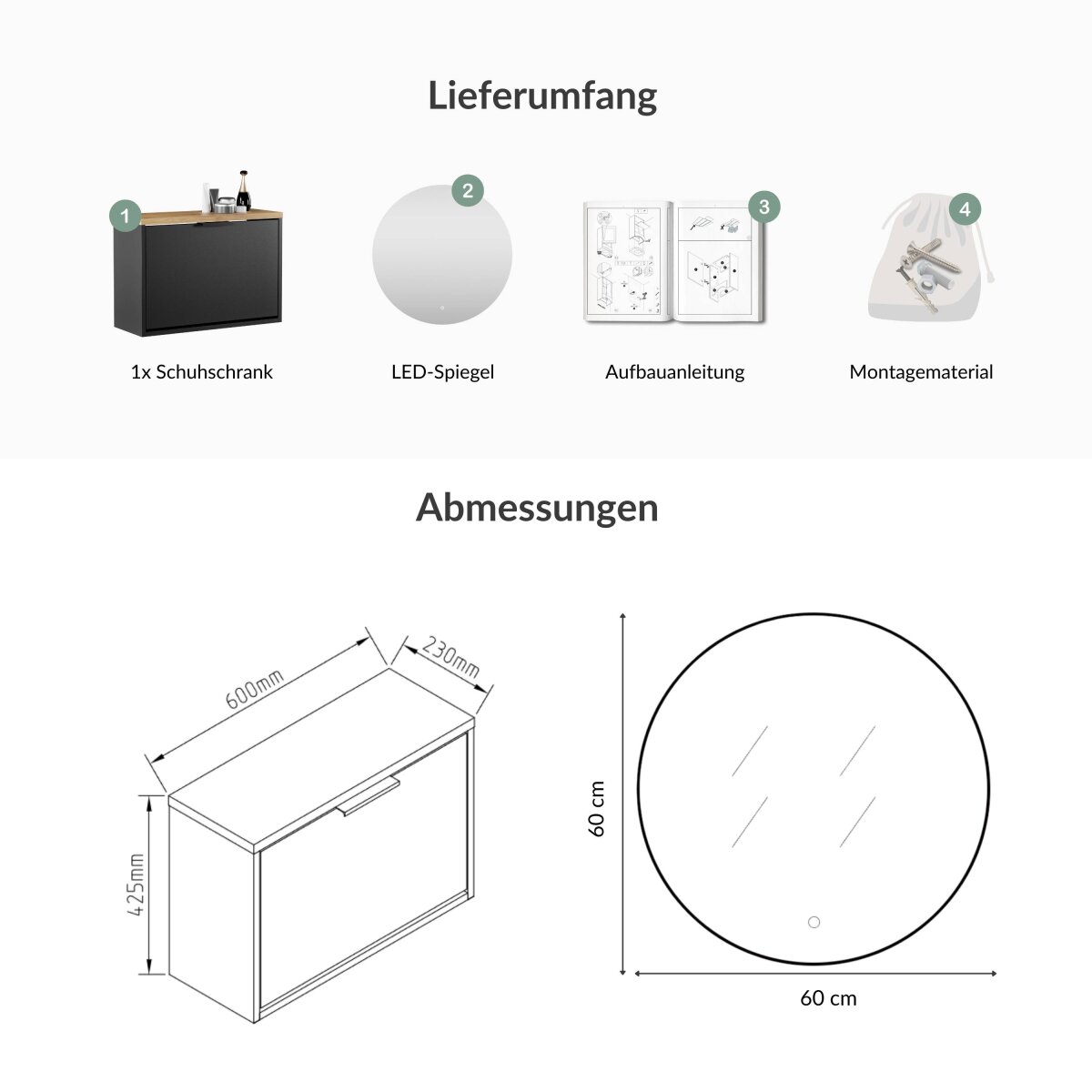 | Lieferungsumfang: | 1x Schuhschrank, 1x LED-Spiegel, 1x Montagematerial, 1x Montageanleitung |