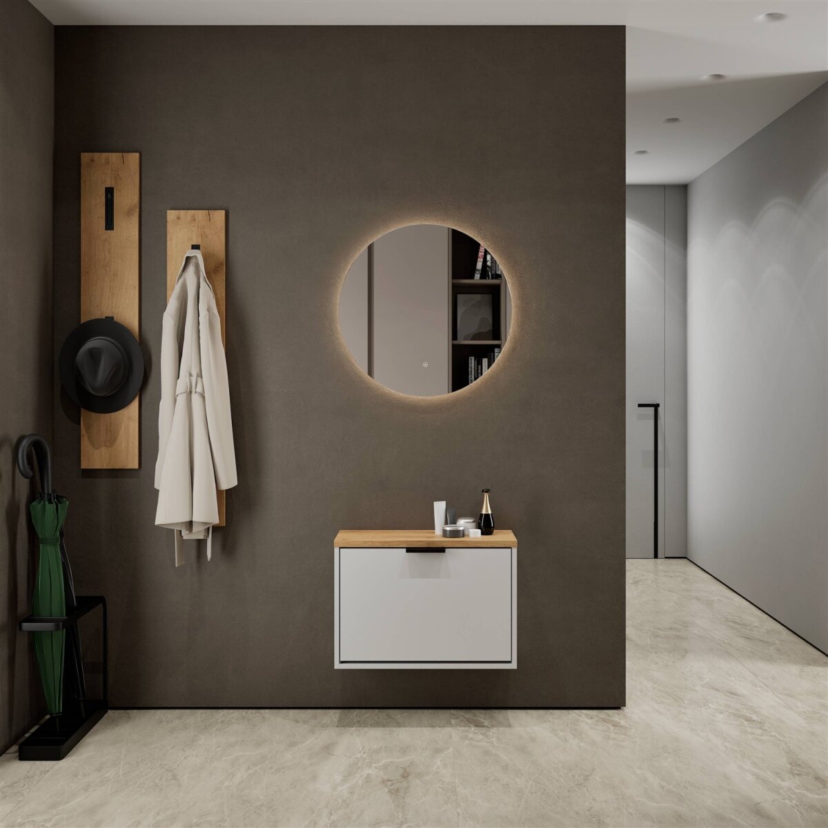 Der NOVA Spiegel (⌀ 60 cm) integriert sich ideal in Ihrem Flur oder Garderobe und sorgt dank der integrierten Beleuchtung mit neutral weißem Licht (4200K) für eine und angenehme Ausleuchtung