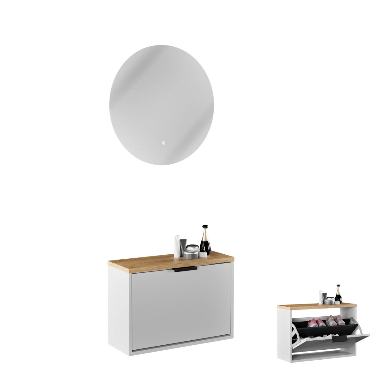 | Lieferungsumfang: | 1x Schuhschrank, 1x LED-Spiegel, 1x Montagematerial, 1x Montageanleitung |