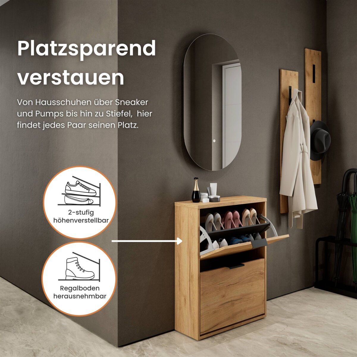 Der integrierte Regalboden lässt sich zweifach in der Höhe verstellen oder bei Bedarf vollständig entnehmen. Dadurch kann der Innenraum optimal an unterschiedliche Schuhtypen angepasst werden – von flachen Sneakers bis hin zu Stiefeletten oder Absatzschuhen. So bleibt der Eingangsbereich stets ordentlich und strukturiert.
