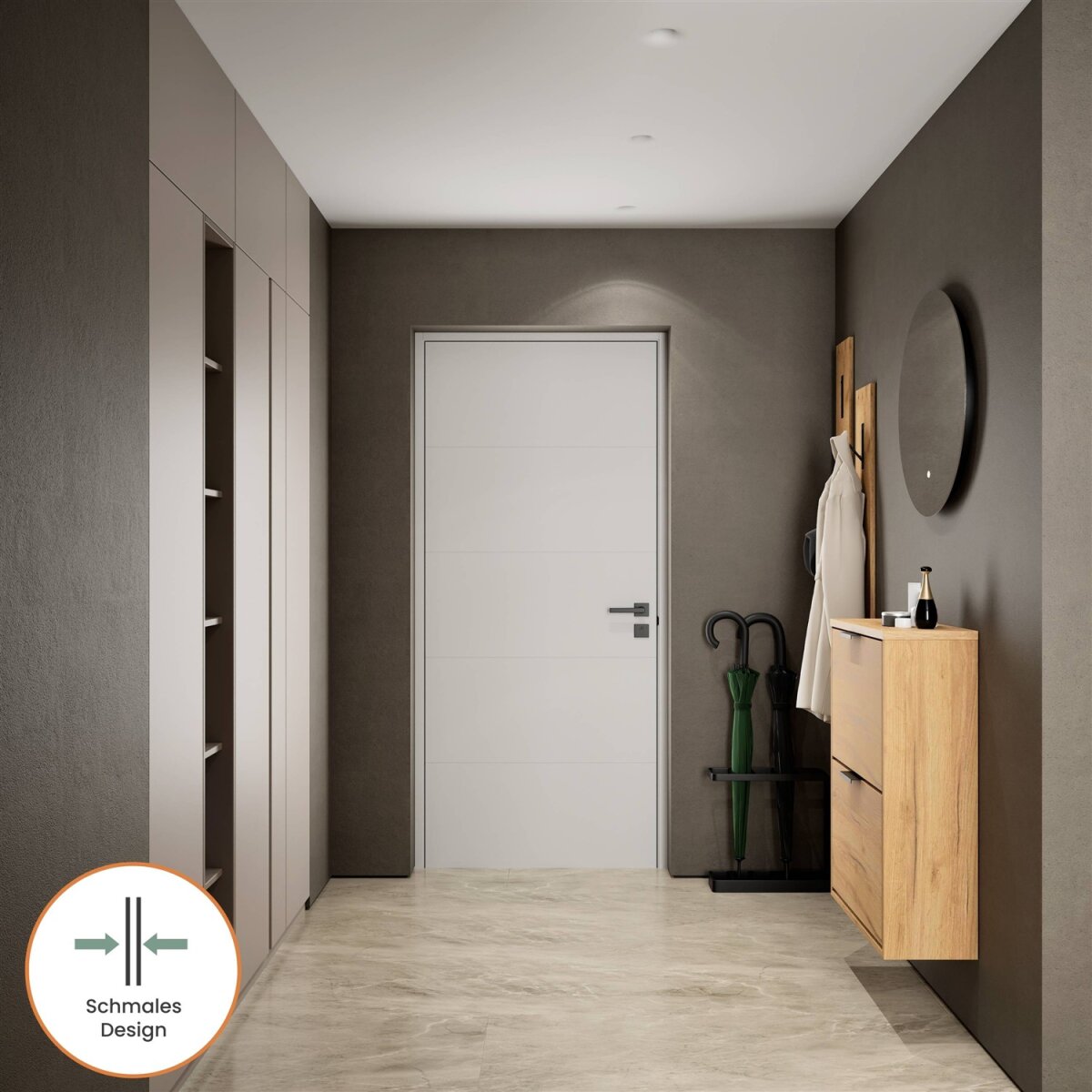 Dieser moderne Schuhschrank ist die perfekte Lösung für alle, die auch in engen Fluren oder kompakten Dielen nicht auf Stil und Ordnung verzichten möchten. Mit einer Tiefe von nur 23 cm bietet er überraschend viel Stauraum bei minimalem Platzbedarf. Hinter der grifflosen Klappe verbirgt sich ein durchdacht strukturierter Innenraum mit einem flexibel nutzbaren Regalboden – ideal zur Aufbewahrung verschiedenster Schuhtypen.