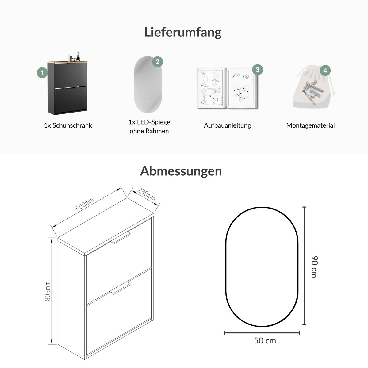 | Lieferungsumfang: | 1x Schuhschrank, 1x LED-Spiegel, 1x Montagematerial, 1x Montageanleitung |