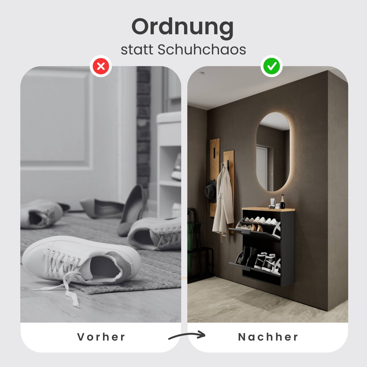 | Kundenhinweise: | Der Schuhschrank kann bodenstehend oder erhöht hängend montiert werden. |
