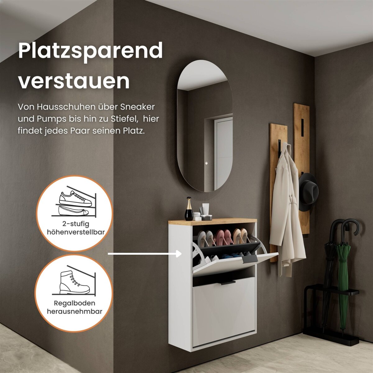 Der integrierte Regalboden lässt sich zweifach in der Höhe verstellen oder bei Bedarf vollständig entnehmen. Dadurch kann der Innenraum optimal an unterschiedliche Schuhtypen angepasst werden – von flachen Sneakers bis hin zu Stiefeletten oder Absatzschuhen. So bleibt der Eingangsbereich stets ordentlich und strukturiert.