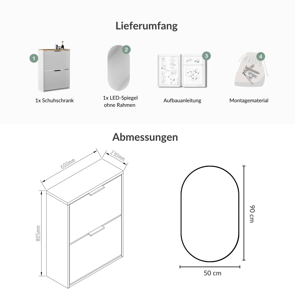 | Lieferungsumfang: | 1x Schuhschrank, 1x LED-Spiegel, 1x Montagematerial, 1x Montageanleitung |