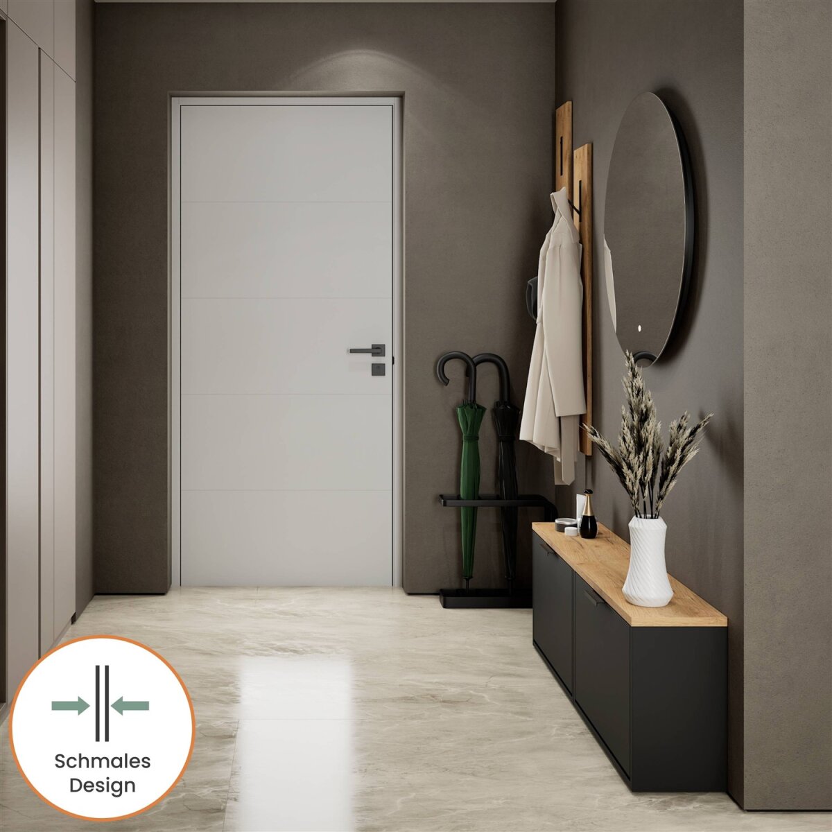 Der Doppel Schuhschrank STIVIO vereint modernes Design, funktionale Ausstattung und eine ästhetische Leichtigkeit, die besonders in schmalen Fluren oder kompakten Dielen überzeugt. Mit seiner schlanken Tiefe von nur 23 cm bietet STIVIO überraschend viel Stauraum, ohne den Raum einzuengen.