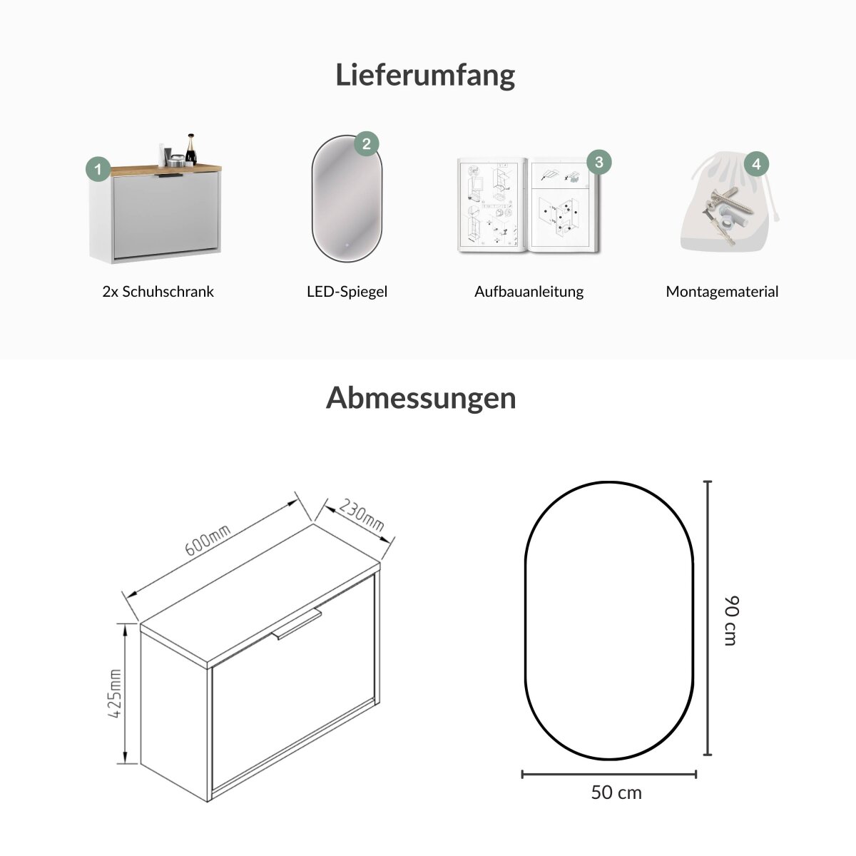 | Lieferungsumfang: | 1x Schuhschrank, 1x LED-Spiegel, 1x Montagematerial, 1x Montageanleitung |