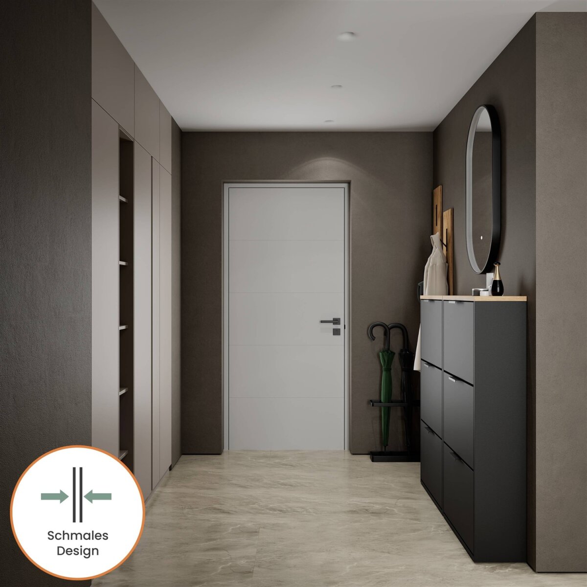 Dieser moderne Schuhschrank ist die perfekte Lösung für alle, die auch in engen Fluren oder kompakten Dielen nicht auf Stil und Ordnung verzichten möchten. Mit einer Tiefe von nur 23 cm bietet er überraschend viel Stauraum bei minimalem Platzbedarf. Hinter der grifflosen Klappe verbirgt sich ein durchdacht strukturierter Innenraum mit einem flexibel nutzbaren Regalboden – ideal zur Aufbewahrung verschiedenster Schuhtypen.
