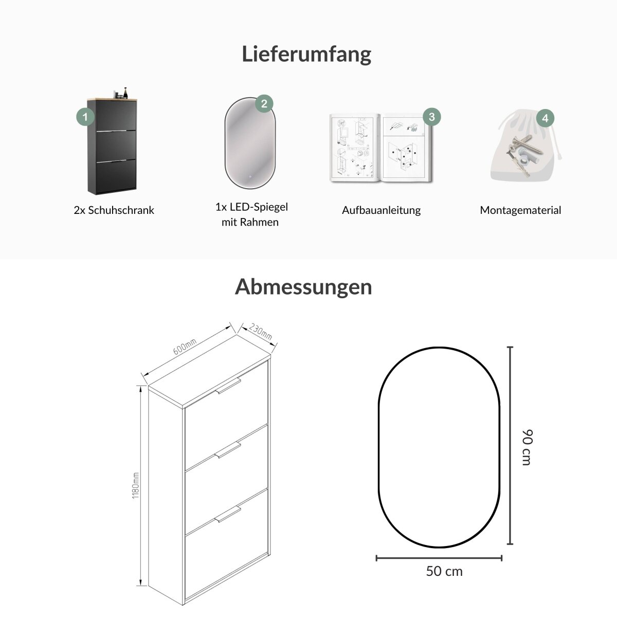 | Lieferungsumfang: | 1x Schuhschrank, 1x LED-Spiegel, 1x Montagematerial, 1x Montageanleitung |