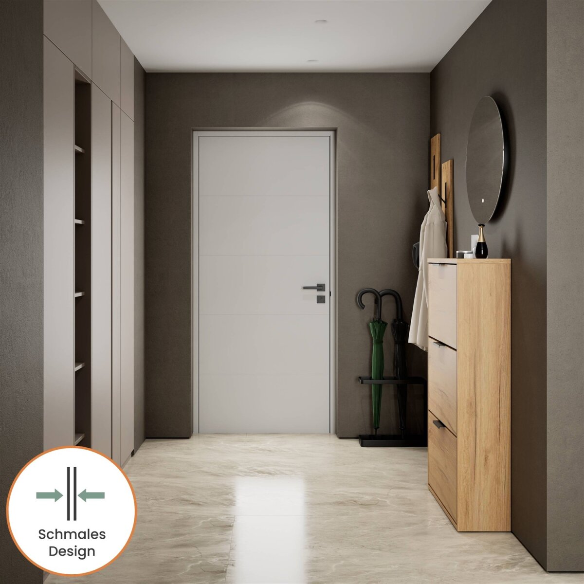 Der Schuhschrank STIVIO vereint modernes Design, funktionale Ausstattung und eine ästhetische Leichtigkeit, die besonders in schmalen Fluren oder kompakten Dielen überzeugt. Mit seiner schlanken Tiefe von nur 23 cm bietet STIVIO überraschend viel Stauraum, ohne den Raum einzuengen.