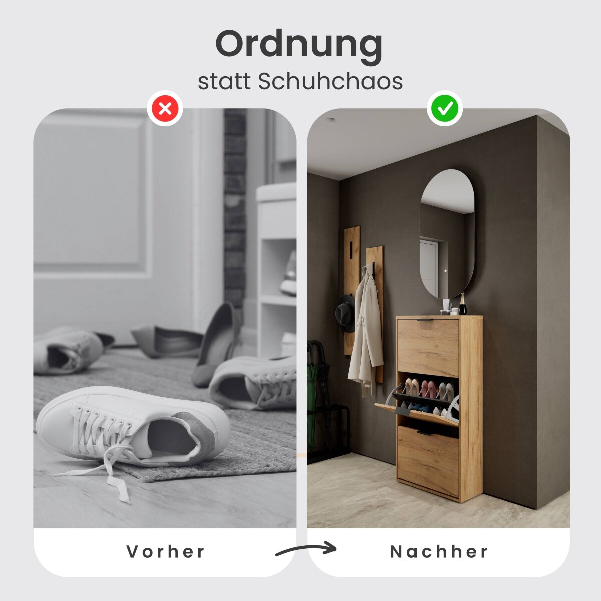| Kundenhinweise: | Der Schuhschrank kann bodenstehend oder erhöht hängend montiert werden. Bei bodenstehender Nutzung wird aus Sicherheitsgründen eine zusätzliche Befestigung an der Wand empfohlen. |