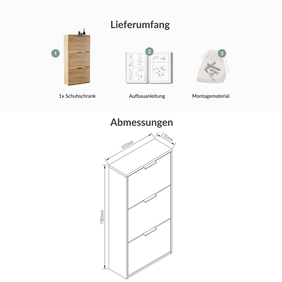 | Lieferungsumfang: | 1x Schuhschrank, 1x Montagematerial, 1x Montageanleitung |
