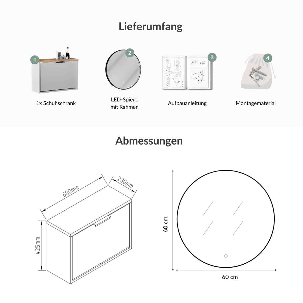 | Lieferungsumfang: | 1x Schuhschrank, 1x LED-Spiegel, 1x Montagematerial, 1x Montageanleitung |