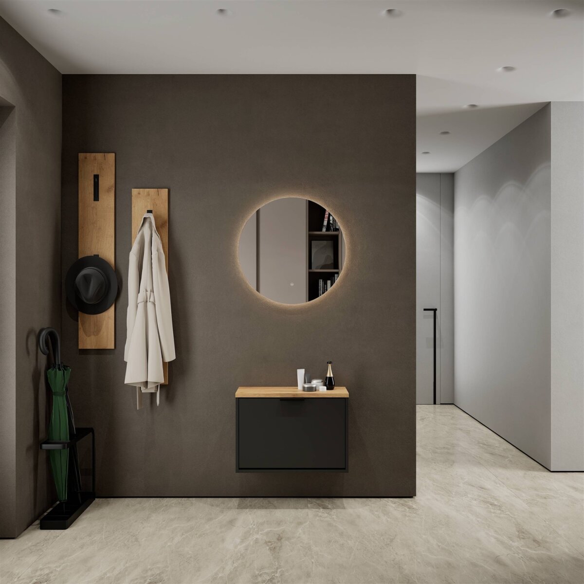 Der NOVA Spiegel (⌀ 60 cm) integriert sich ideal in Ihrem Flur oder Garderobe und sorgt dank der integrierten Beleuchtung mit neutral weißem Licht (4200K) für eine und angenehme Ausleuchtung
