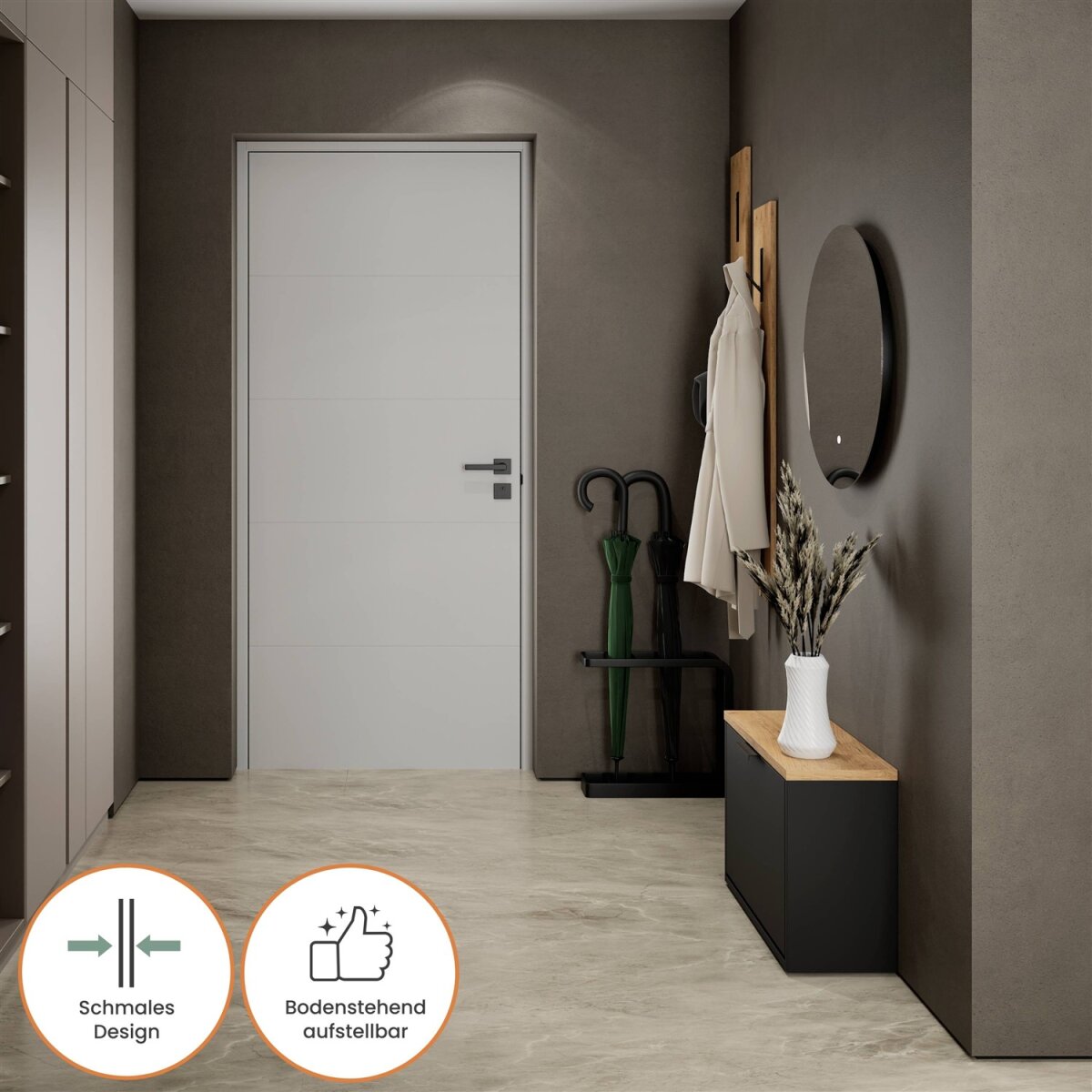 Dieser moderne Schuhschrank ist die perfekte Lösung für alle, die auch in engen Fluren oder kompakten Dielen nicht auf Stil und Ordnung verzichten möchten. Mit einer Tiefe von nur 23 cm bietet er überraschend viel Stauraum bei minimalem Platzbedarf. Hinter der grifflosen Klappe verbirgt sich ein durchdacht strukturierter Innenraum mit einem flexibel nutzbaren Regalboden – ideal zur Aufbewahrung verschiedenster Schuhtypen.