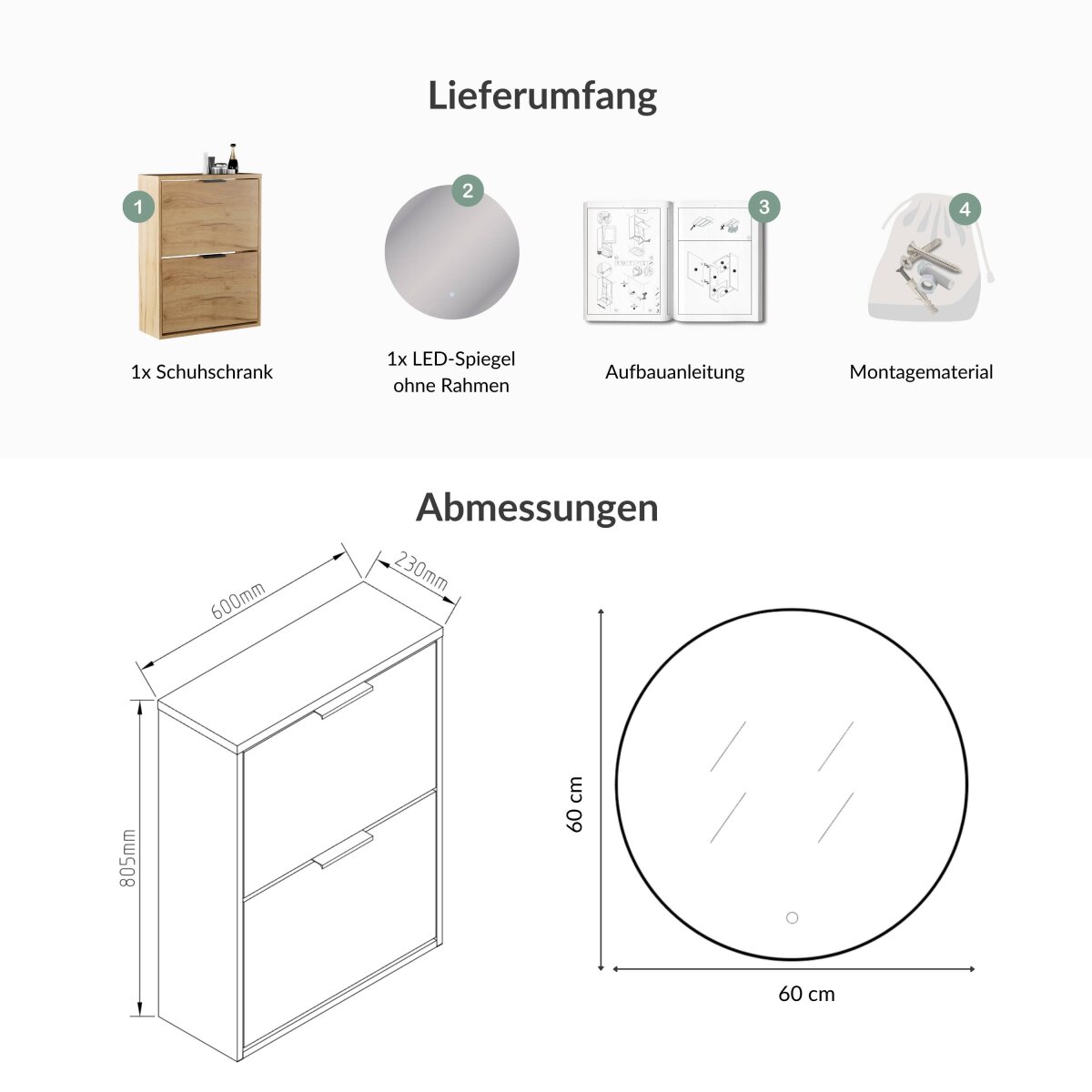 | Lieferungsumfang: | 1x Schuhschrank, 1x LED-Spiegel, 1x Montagematerial, 1x Montageanleitung |