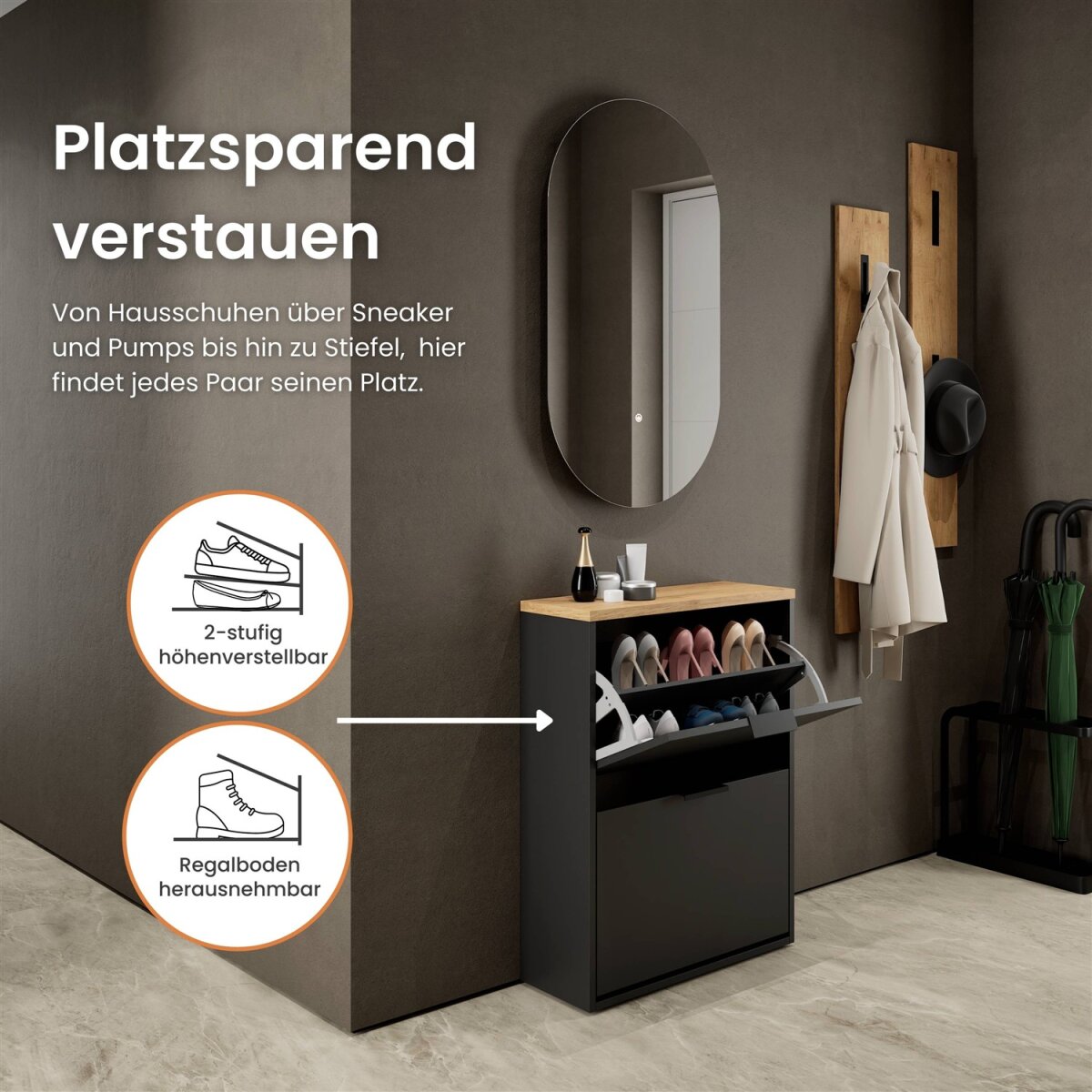 Der integrierte Regalboden lässt sich zweifach in der Höhe verstellen oder bei Bedarf vollständig entnehmen. Dadurch kann der Innenraum optimal an unterschiedliche Schuhtypen angepasst werden – von flachen Sneakers bis hin zu Stiefeletten oder Absatzschuhen. So bleibt der Eingangsbereich stets ordentlich und strukturiert.