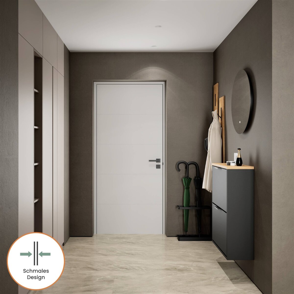 Dieser moderne Schuhschrank ist die perfekte Lösung für alle, die auch in engen Fluren oder kompakten Dielen nicht auf Stil und Ordnung verzichten möchten. Mit einer Tiefe von nur 23 cm bietet er überraschend viel Stauraum bei minimalem Platzbedarf. Hinter der grifflosen Klappe verbirgt sich ein durchdacht strukturierter Innenraum mit einem flexibel nutzbaren Regalboden – ideal zur Aufbewahrung verschiedenster Schuhtypen.