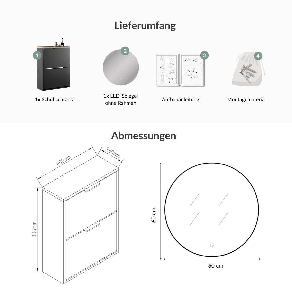 | Lieferungsumfang: | 1x Schuhschrank, 1x LED-Spiegel, 1x Montagematerial, 1x Montageanleitung |