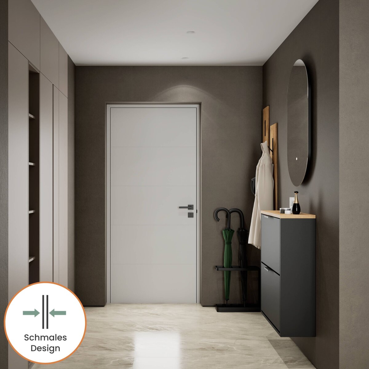 Der Schuhschrank STIVIO vereint modernes Design, funktionale Ausstattung und eine ästhetische Leichtigkeit, die besonders in schmalen Fluren oder kompakten Dielen überzeugt. Mit seiner schlanken Tiefe von nur 23 cm bietet STIVIO überraschend viel Stauraum, ohne den Raum einzuengen.