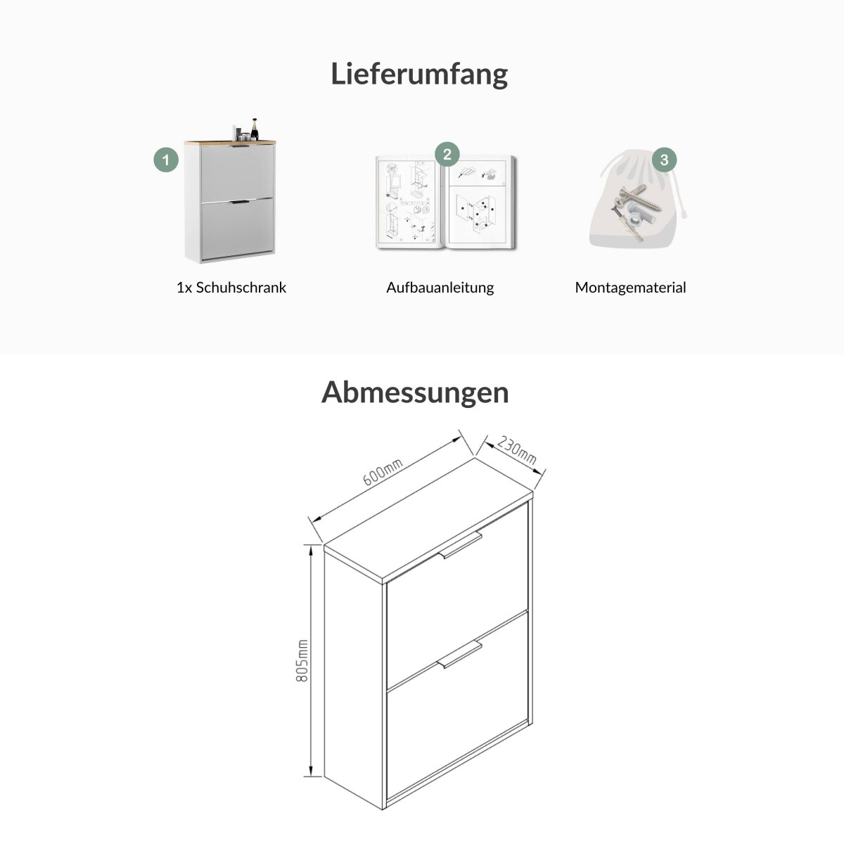 | Lieferungsumfang: | 1x Schuhschrank, 1x Montagematerial, 1x Montageanleitung |