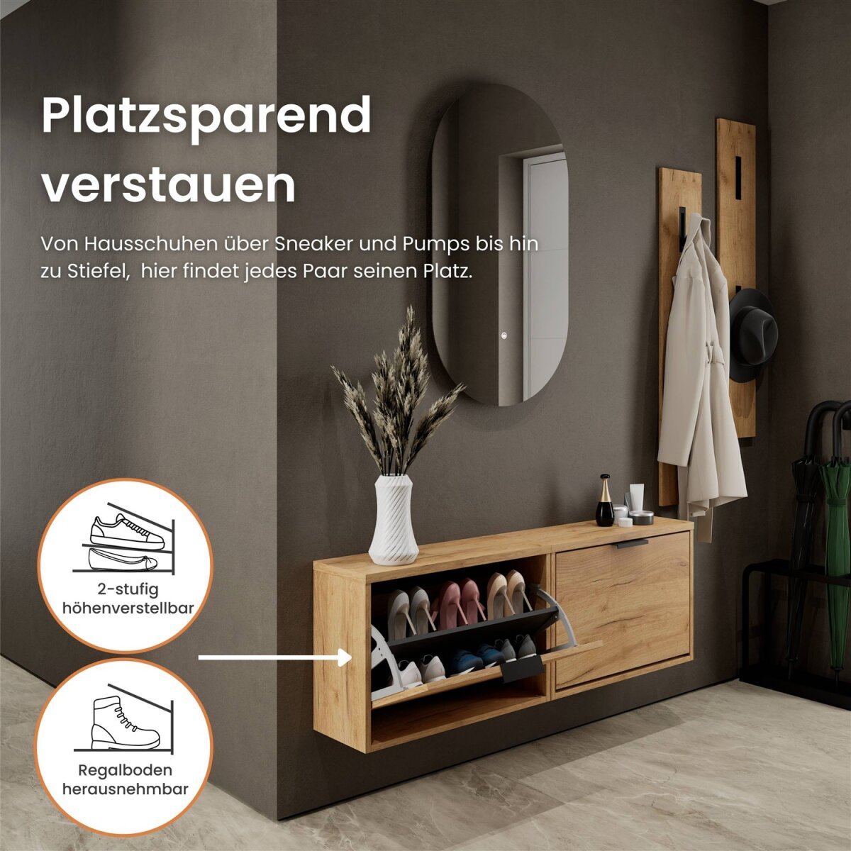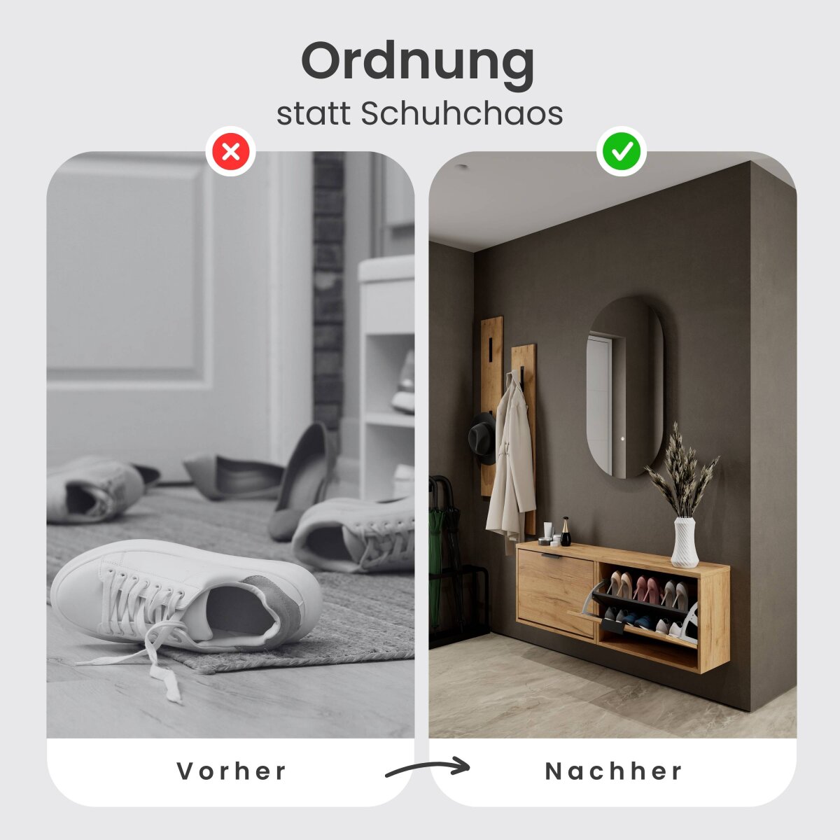 Der integrierte Regalboden lässt sich zweifach in der Höhe verstellen oder bei Bedarf vollständig entnehmen. Dadurch kann der Innenraum optimal an unterschiedliche Schuhtypen angepasst werden – von flachen Sneakers bis hin zu Stiefeletten oder Absatzschuhen. So bleibt der Eingangsbereich stets ordentlich und strukturiert.