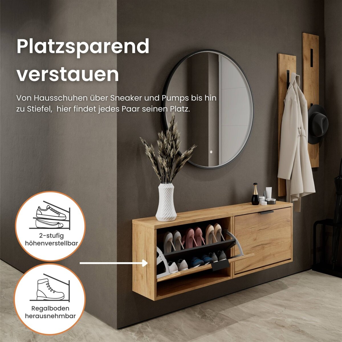 Die strapazierfähige Melaminbeschichtung schützt vor Feuchtigkeit, Kratzern und Schmutz. Perfekt geeignet für den Alltag mit nassen Schuhen im Eingangsbereich. Der Korpus aus hochwertigem Holzwerkstoff sorgt für Stabilität und eine lange Lebensdauer. Die Klappmechanik mit modernen Griffen ermöglicht eine einfache und bequeme Nutzung – auch bei wenig Platz.