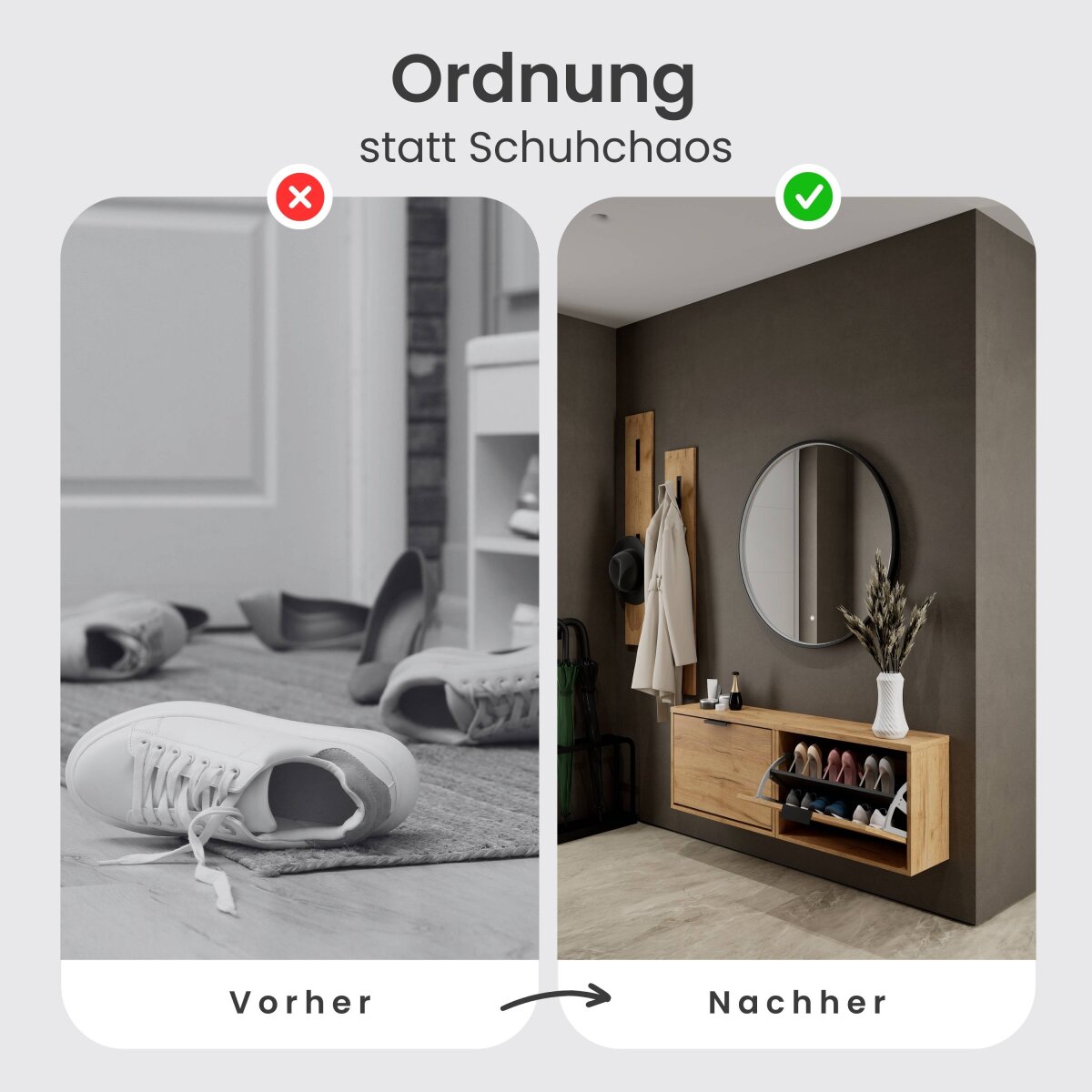 Der integrierte Regalboden lässt sich zweifach in der Höhe verstellen oder bei Bedarf vollständig entnehmen. Dadurch kann der Innenraum optimal an unterschiedliche Schuhtypen angepasst werden – von flachen Sneakers bis hin zu Stiefeletten oder Absatzschuhen. So bleibt der Eingangsbereich stets ordentlich und strukturiert.