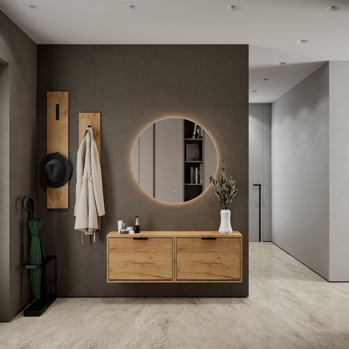Der NOVA Spiegel (⌀ 80 cm) integriert sich ideal in Ihrem Flur und sorgt dank der integrierten Beleuchtung mit neutral weißem Licht (4200K) für eine und angenehme Ausleuchtung)