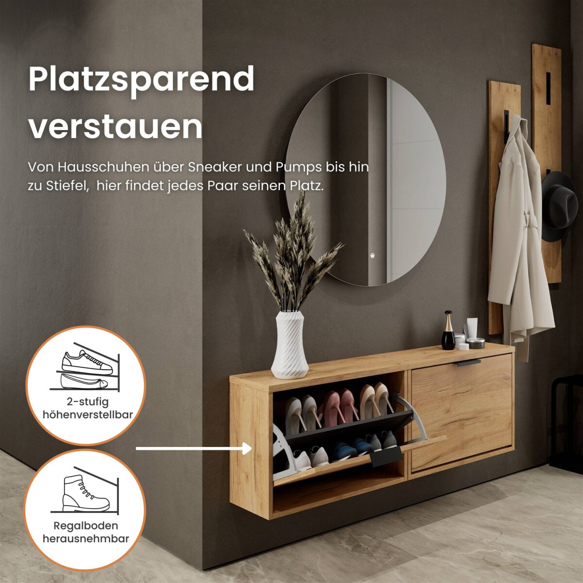 | Kundenhinweise: | Der Schuhschrank kann bodenstehend oder erhöht hängend montiert werden. |