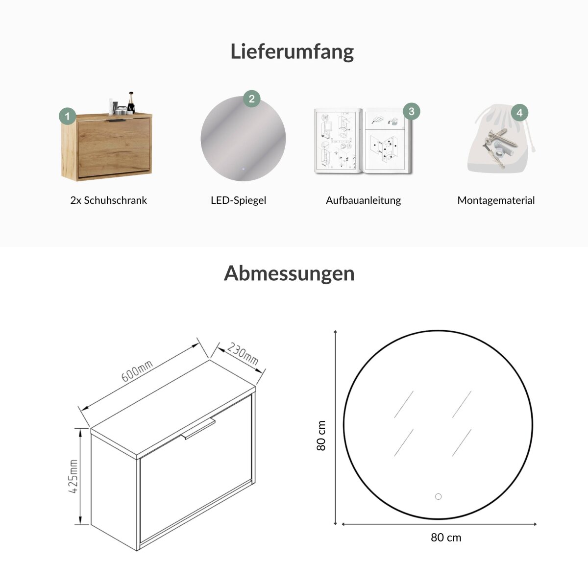 | Lieferungsumfang: | 2x Schuhschrank, 1x LED-Spiegel, 1x Montagematerial, 1x Montageanleitung |