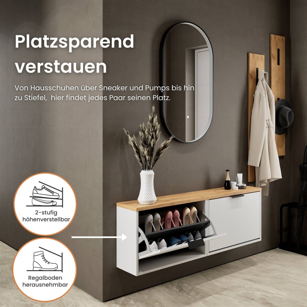 | Kundenhinweise: | Der Schuhschrank kann bodenstehend oder erhöht hängend montiert werden. |