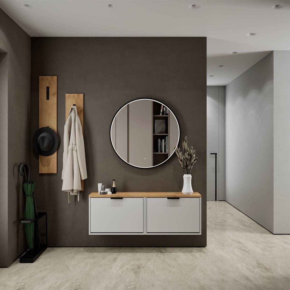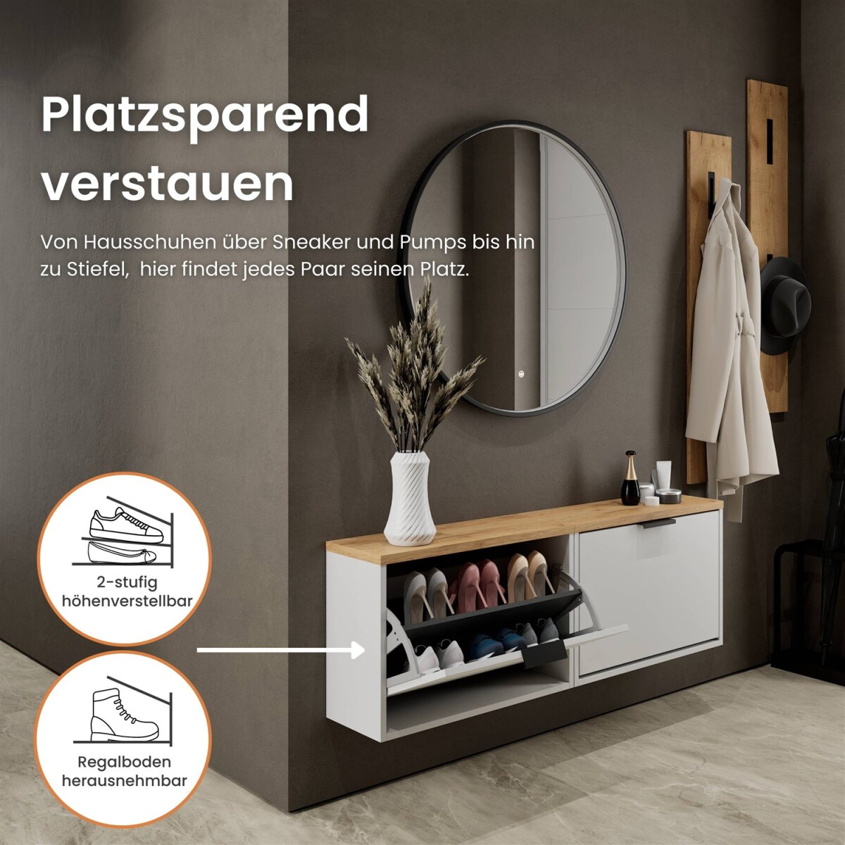 Der integrierte Regalboden lässt sich zweifach in der Höhe verstellen oder bei Bedarf vollständig entnehmen. Dadurch kann der Innenraum optimal an unterschiedliche Schuhtypen angepasst werden – von flachen Sneakers bis hin zu Stiefeletten oder Absatzschuhen. So bleibt der Eingangsbereich stets ordentlich und strukturiert.