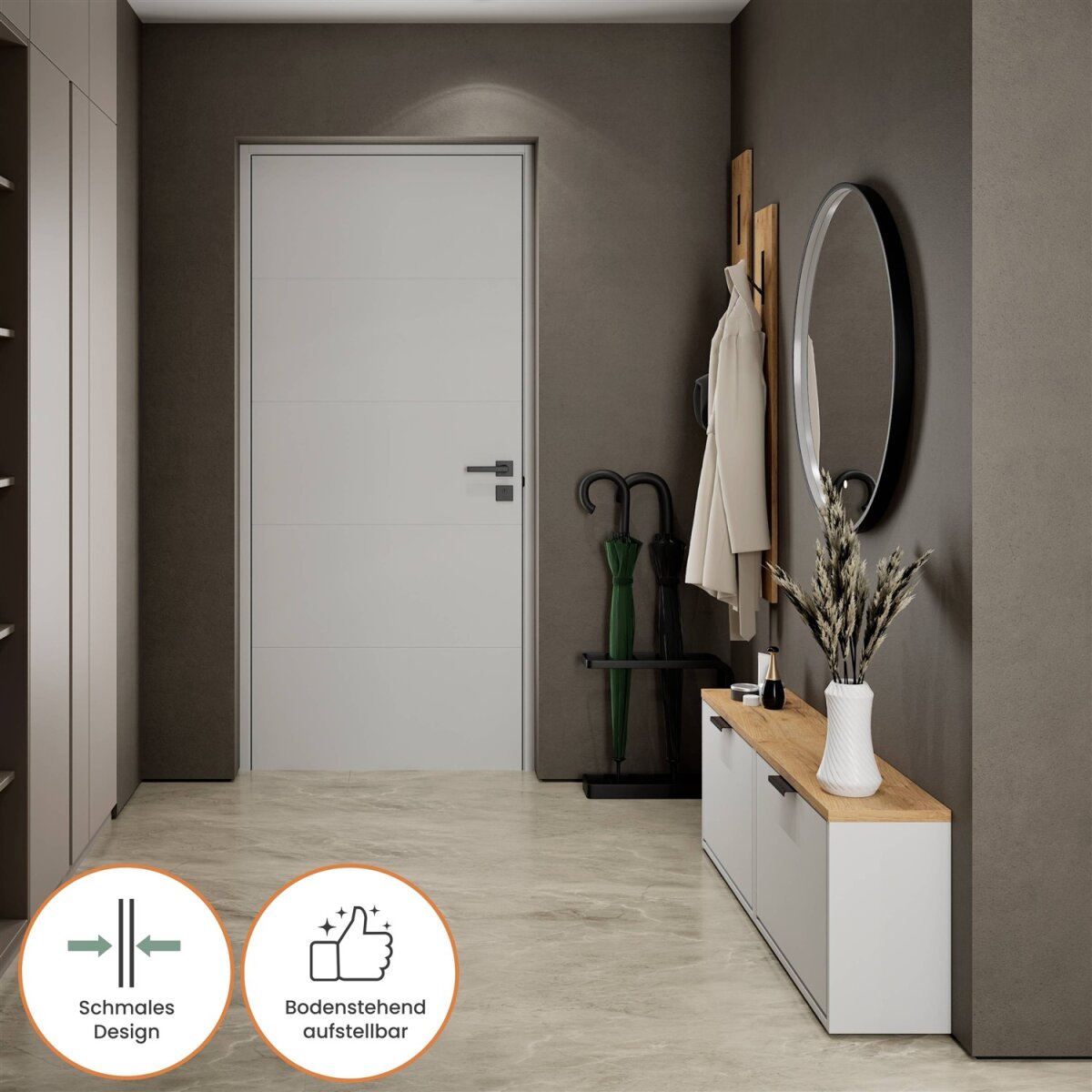 Dieser moderne Schuhschrank ist die perfekte Lösung für alle, die auch in engen Fluren oder kompakten Dielen nicht auf Stil und Ordnung verzichten möchten. Mit einer Tiefe von nur 23 cm bietet er überraschend viel Stauraum bei minimalem Platzbedarf. Hinter der grifflosen Klappe verbirgt sich ein durchdacht strukturierter Innenraum mit einem flexibel nutzbaren Regalboden – ideal zur Aufbewahrung verschiedenster Schuhtypen.