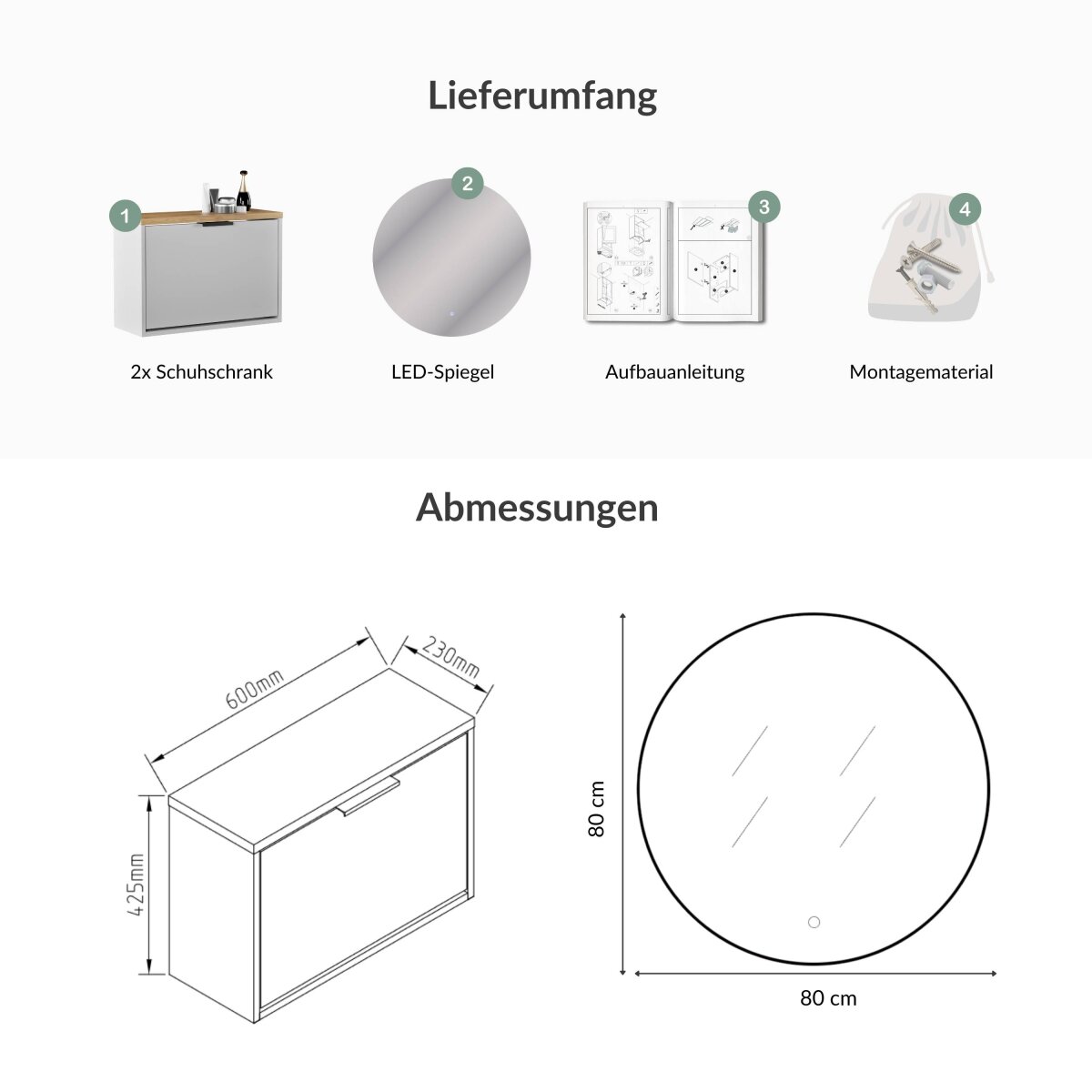 | Lieferungsumfang: | 2x Schuhschrank, 1x LED-Spiegel, 1x Montagematerial, 1x Montageanleitung |
